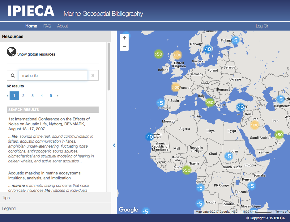 This project required to create an interactive Marine Geospatial Bibliography. Over 10,000 science articles and documents about the environment and natural resources had to be geo-located and put onto a map. Geospatial data and layers are served with GeoServer (open source) and were visualised via Google Maps. Data is stored in PostgresSQL-DB (with PostGIS extension). All infrastructure is hosted on AWS.